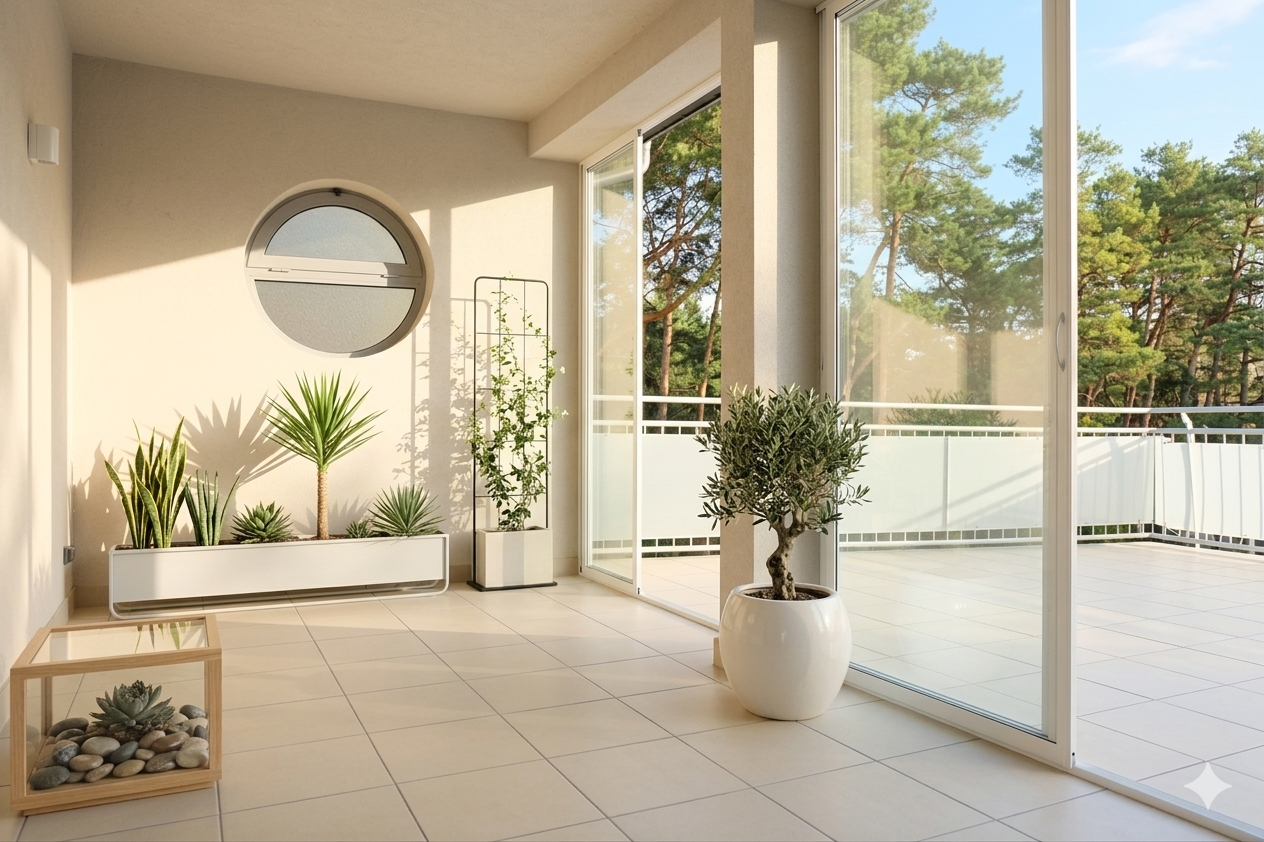The lower level features a living room with a kitchenette, seamlessly flowing into a winter garden that opens onto one of two private terraces – a natural spot for dinners, sunsets, and relaxed evenings with friends. The upper level hosts two bedrooms: the main bedroom with a private bathroom for the couple and a second bedroom with its own bathroom, perfect for guests who don’t intrude on the daily life of the owners.