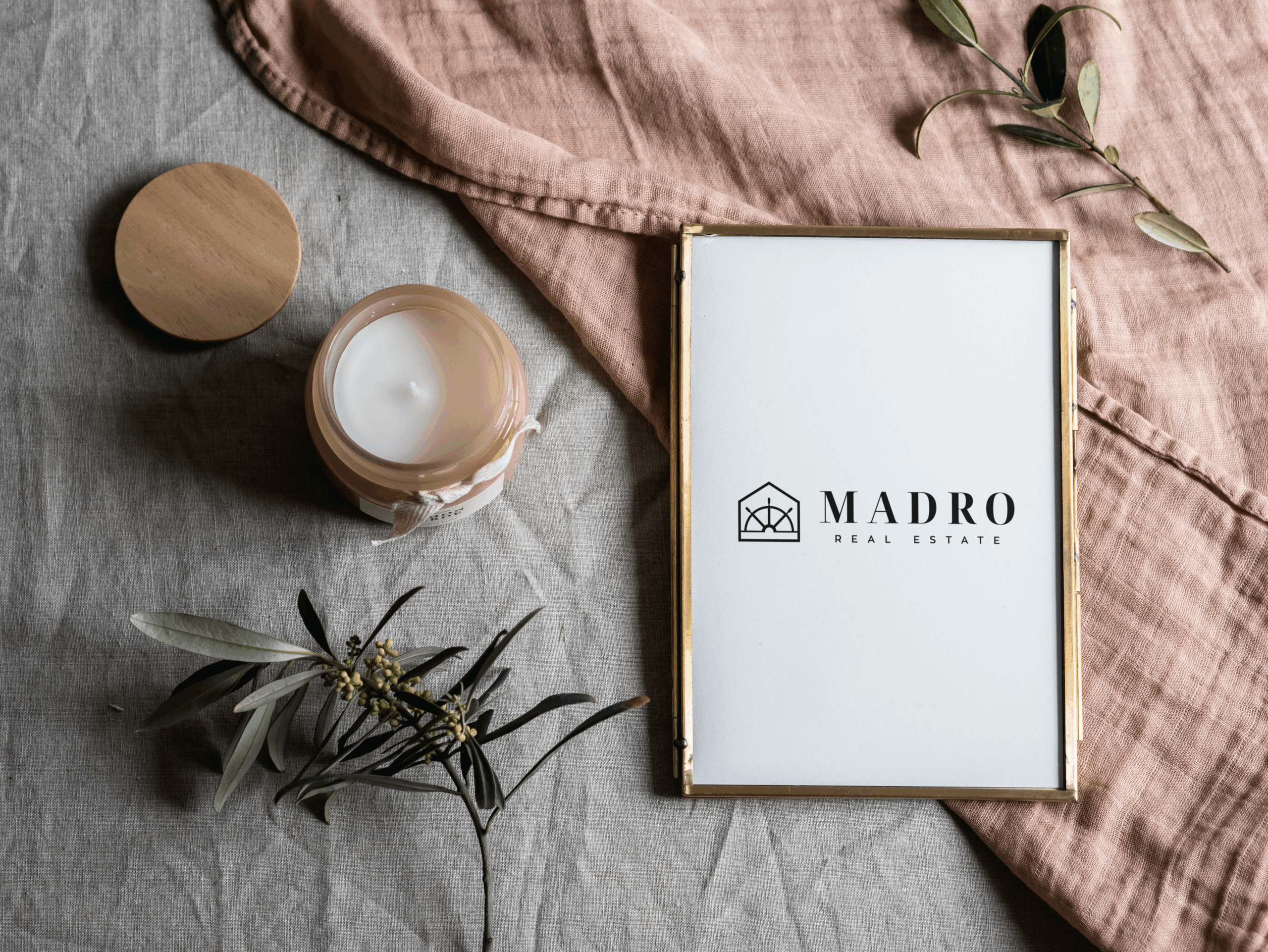 Golden portrait frame on the cloth beside the candle_Madro Real Estate logo przezroczyste tło (5)